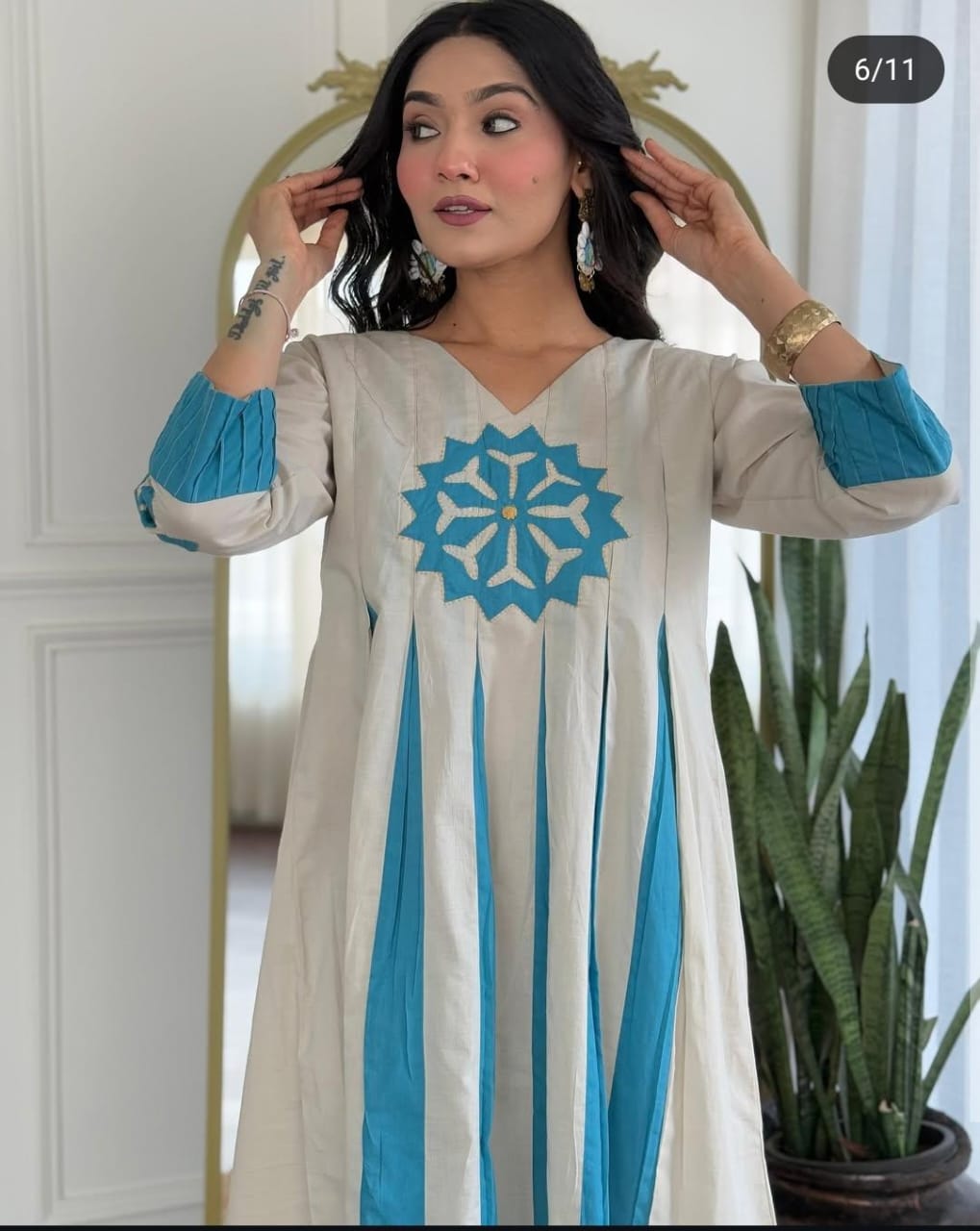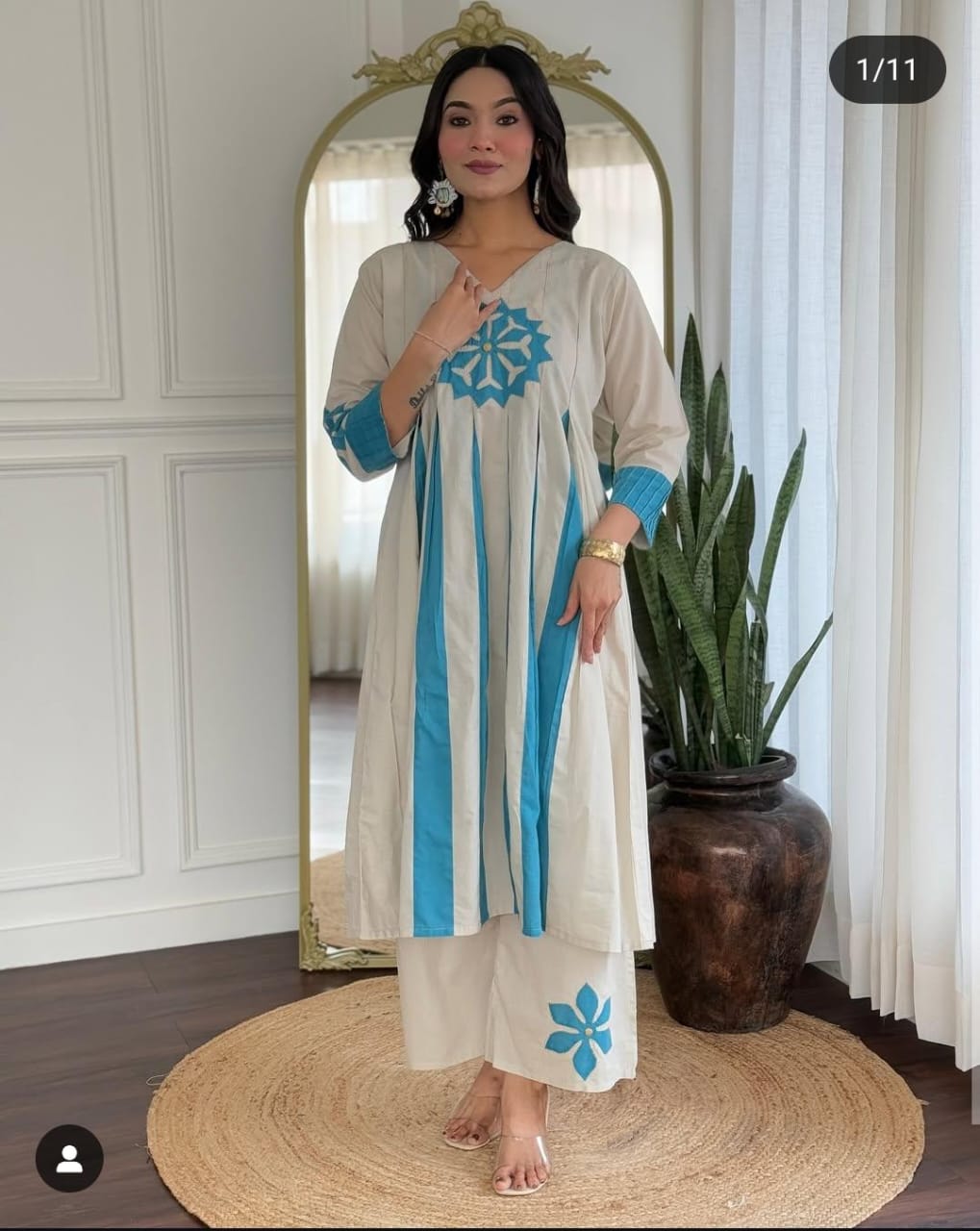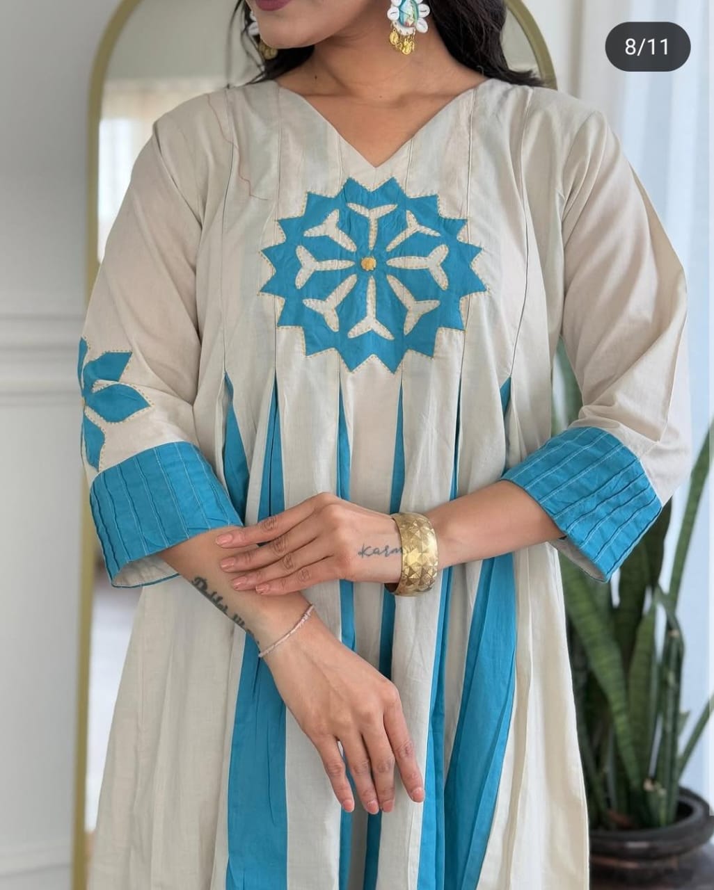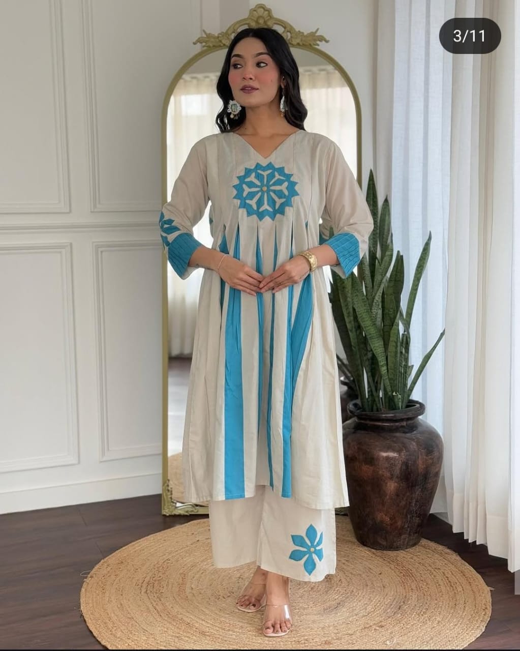Let your style bloom with our Aqua Bloom Kurti Pant Set, where contemporary flair meets the timeless beauty of Jaipuri cotton. Crafted from pure, breathable cotton, this cream-colored kurti features striking aqua blue pleated panels and a bold floral motif that instantly uplifts your look. The 3/4th sleeves with contrast cuffs add a refined touch, while the matching pants with floral appliqué echo the design beautifully.