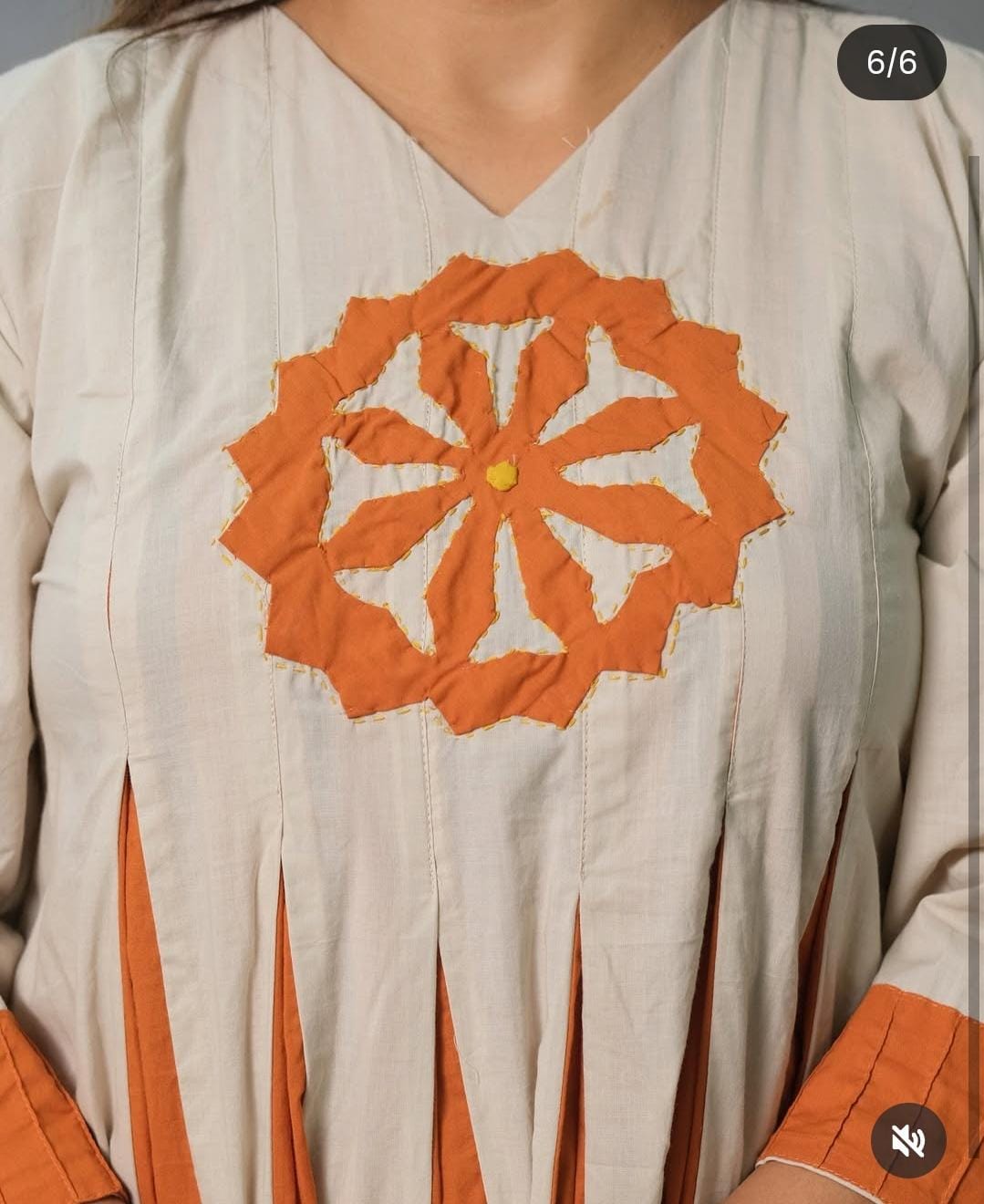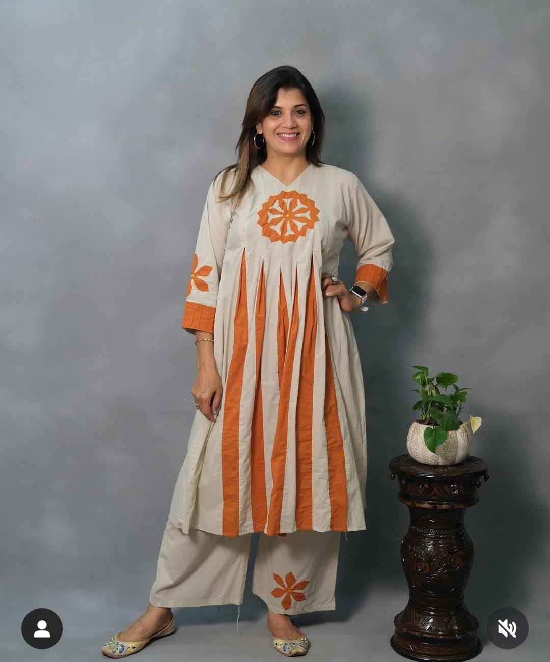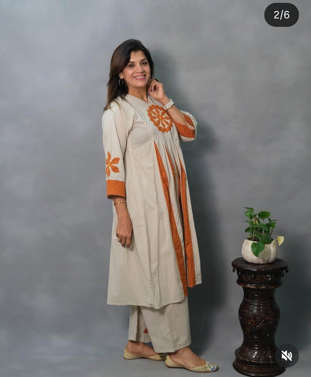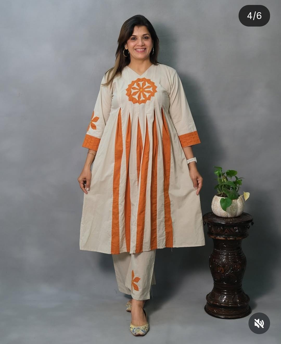 Let your style bloom with our Aqua Bloom Kurti Pant Set, where contemporary flair meets the timeless beauty of Jaipuri cotton. Crafted from pure, breathable cotton, this cream-colored kurti features striking aqua blue pleated panels and a bold floral motif that instantly uplifts your look. The 3/4th sleeves with contrast cuffs add a refined touch, while the matching pants with floral appliqué echo the design beautifully.