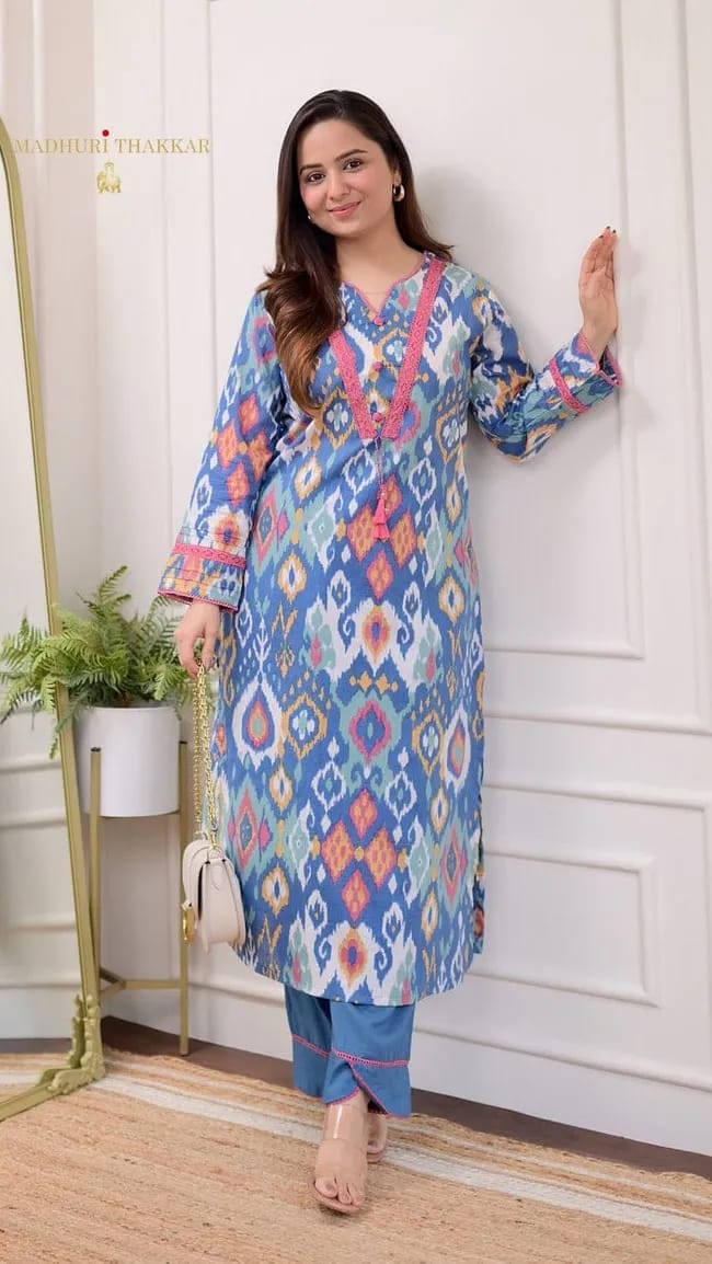 Full heavy cotton with printed work A must’ve for your small gathering and daily rituals Featuring beautiful Heavy 2pcs Suit which crafted with finest lace and prints detail. It is paired with matching pant (Shre syamcoll.union bnk rohit) |