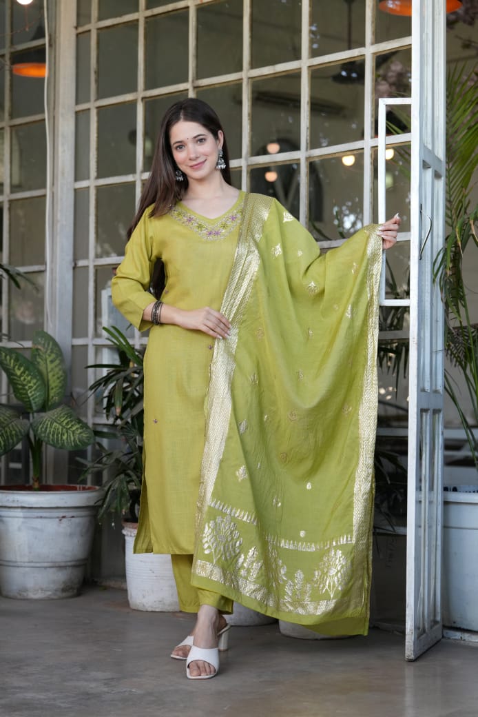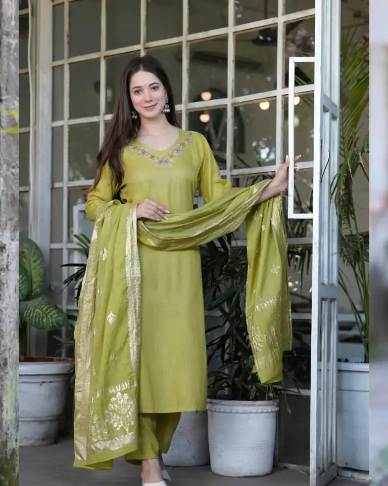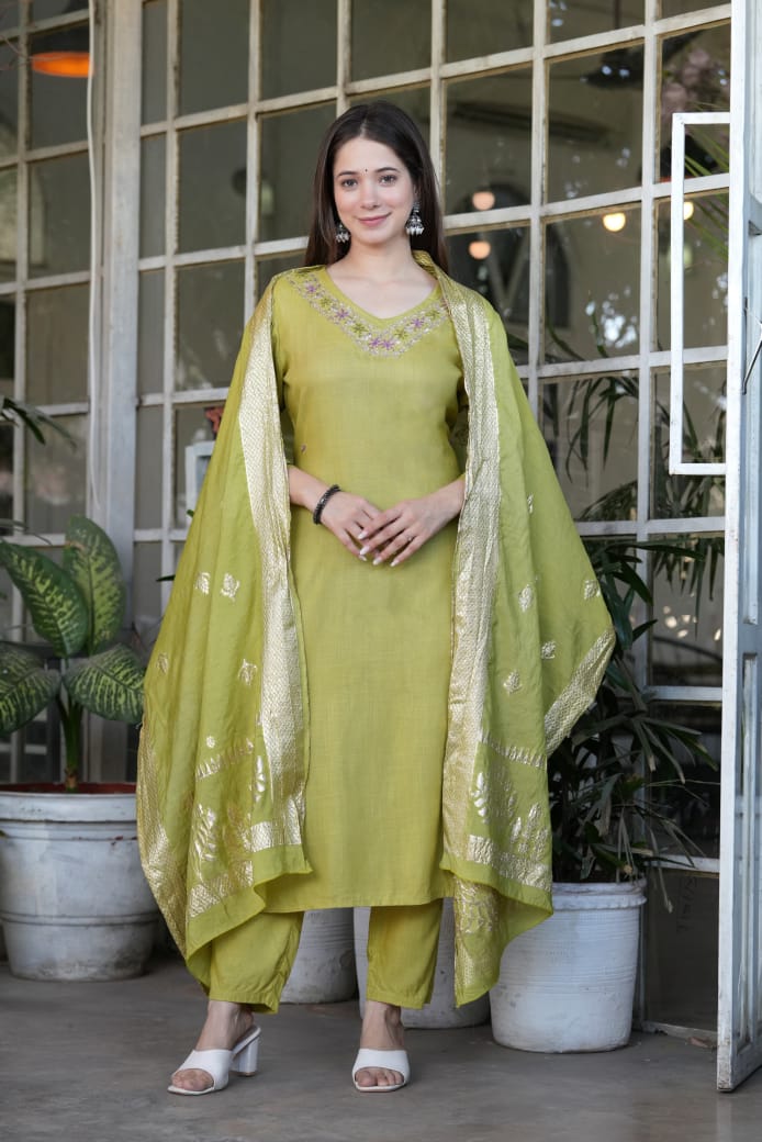 Details | Look straight out of a dreamy movie set as you turn around and walk In this elegant hand embroidery work suit .. the perfect blend of traditional wear and chic design *Kurta length – 44 Pent length – 39 Duppta mtr. – 2.50mtr . Duptta Fabric = *Jaqurad banarsi silk duppta |