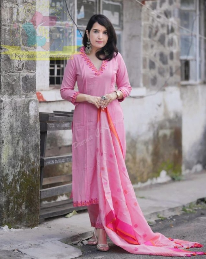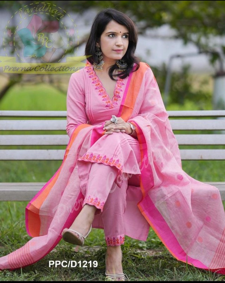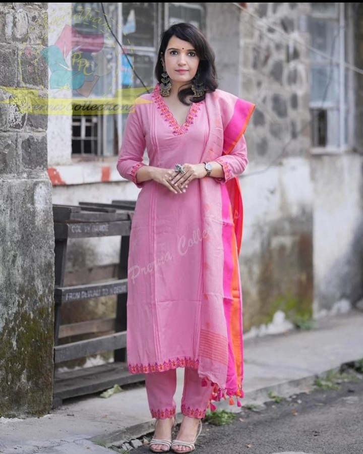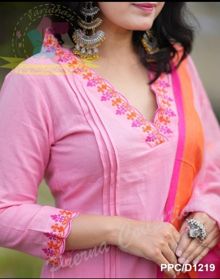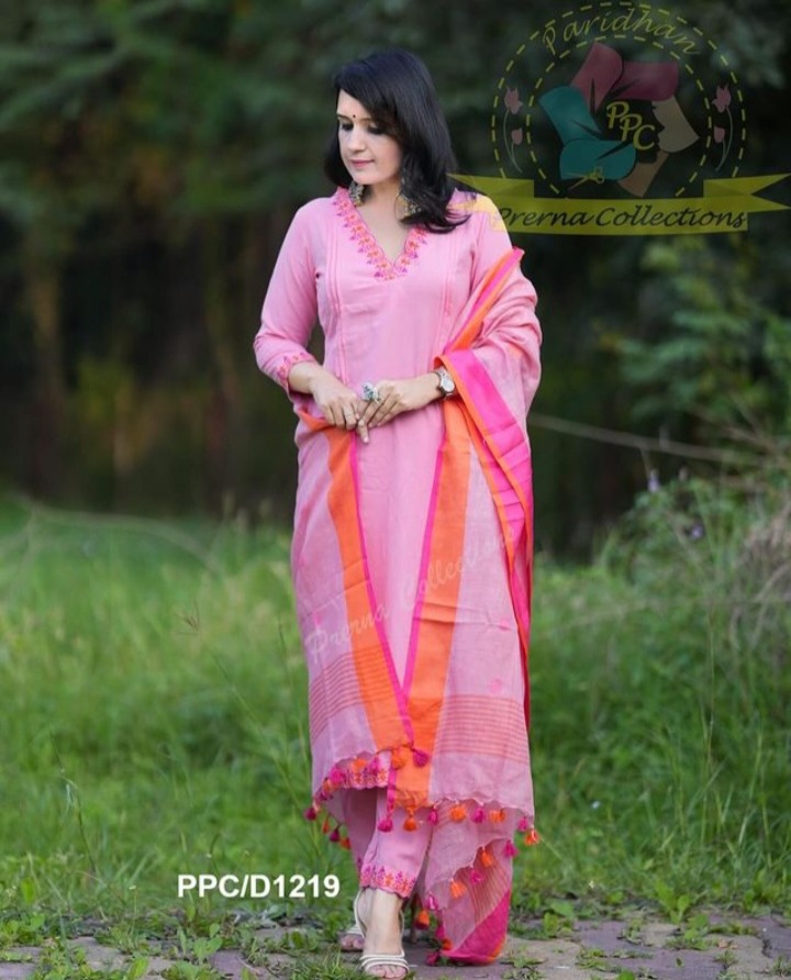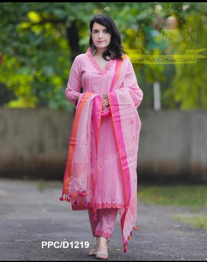 Details | Look pretty and classy in our handloom embroidered set with pure linen butta dupatta in most amazing colour combination pure handloom kurti embroidery work on neck, sleeves with handloom cotton pants with embroidery and cutwork (RR UNIQUE FASHION ) |