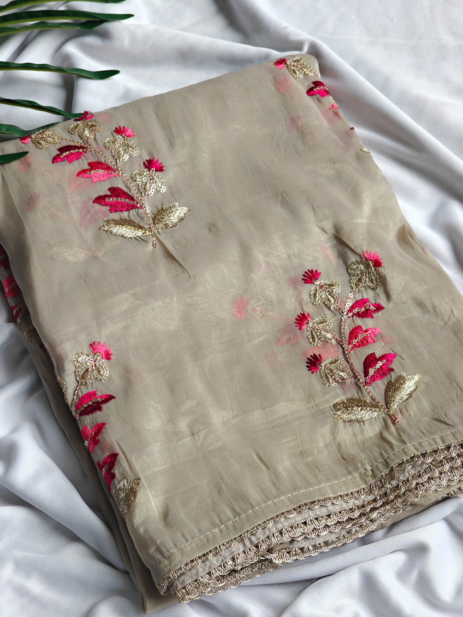 Details | Paper silk crushed saree with beautiful floral embroidery work all over the saree with zari lace stitched on border. Beautiful lace is attached on saree and Teamed with beautiful contrast dyeable blouse (VRAJ FAB) |